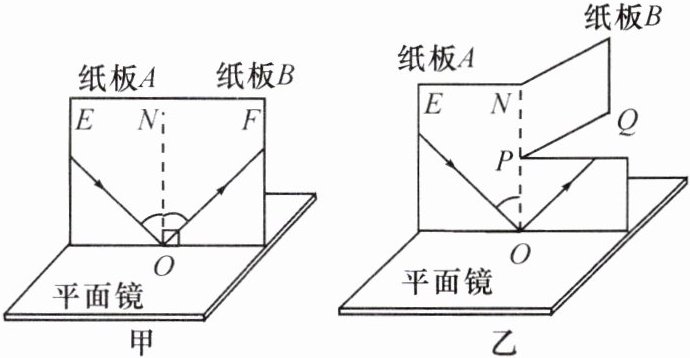 (5) 将纸板 B 沿 PQ 剪开,把纸板 B 的上半部分向后折,如图乙所示,可看到纸板 B 的下半部分有反射光,上半部分无反射光,此现象表明:反射光线、入射光线和法线