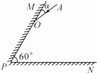 14. (2024·合肥庐阳区期中) 如图,两平面镜 MP、PN 相交,夹角为 60°,一束光线 AO 斜射到 MP 上,经两平面镜反射后最终的反射光线与入射光线 AO 重合,但方向相反,则 AO 与 MP 的夹角 α 为