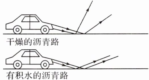 11. 如图所示是晚上汽车在干燥的路面和有积水的路面上行驶时,大灯发出部分光的光路图。说明干燥的路面更容易发生