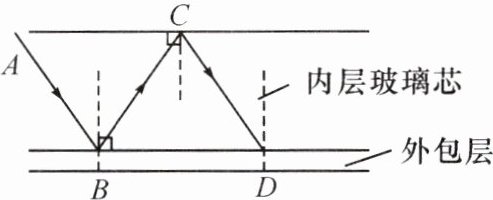 12. 光在玻璃纤维中的传输情况是光线每次由内层玻璃芯射向与外包层的分界面时,均要发生反射,光在不断地反射中沿内层玻璃芯向远处传播。如图所示,当增大入射光线 AB 的入射角时,CD 光线的入射角将
