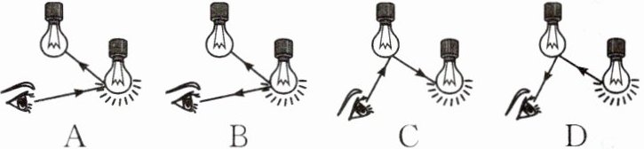 8. 黑暗的房间里有两盏电灯,只有一盏灯点亮,但人能看到未点亮的灯泡。关于“看到未点亮的灯泡”的光路图中,正确的是(