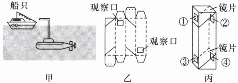 6. 如图甲所示,潜艇中的人利用潜望镜在水下也能观察水面上的情况。利用两块镜片可自制一个简易潜望镜,如图乙、丙所示。用潜望镜可以从海面下看到海面上的船只,说明