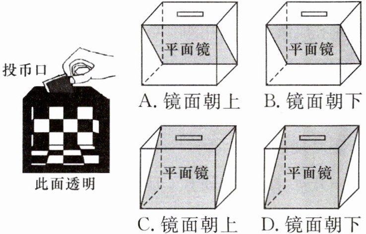 11. 小明在科技节中表演魔术:从投币口投入只有正面透明的棋盘格空箱的硬币消失了!随后他揭秘:这是平面镜和棋盘格共同形成的结果。下列放置平面镜的方式能实现这个魔术效果的是(