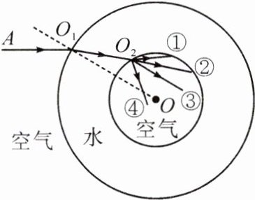 13. 在天宫课堂中,航天员王亚平将空气注入水球,形成的气泡球与水球的球心都在 $ O $ 点。一束光从空气射入水球的光路如图所示,其中球心 $ O $ 与入射点 $ O_1 $ 的连线为法线。则进入气泡球的折射光线可能为(