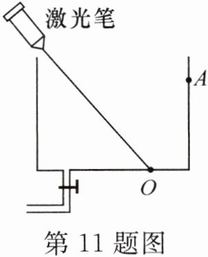 11. 如图所示,一支固定好的激光笔向空水槽底部固定点 $ O $ 射出一束激光。向水槽内加水使水面上升至 $ A $ 点,此时光斑在 $ O $ 点