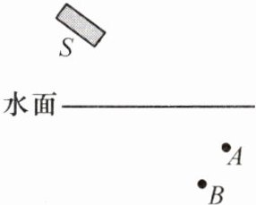 【变式】深圳湾海水清澈见底,水中鱼儿成群。如图中,小安看到水中 $ A $ 处有一条鱼,而 $ B $ 才是鱼的真实位置。现小安利用激光手电筒从 $ S $ 点发出一束光照射到 $ B $ 上,请你在图中完成光路(保留作图痕迹)。