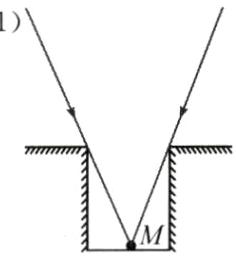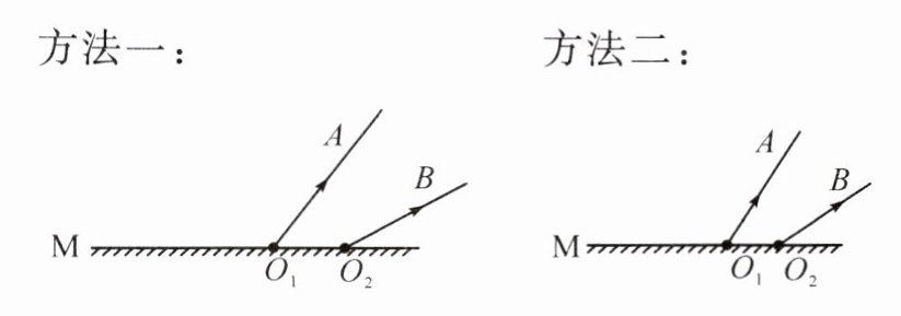 9. 如图所示,$O_{1}A$、$O_{2}B$是平面镜前一点光源 S 发出的光线经平面镜 M 反射后的两条反射光线,请在图中标出光源 S 和像点 S'的位置,并完成光路图。