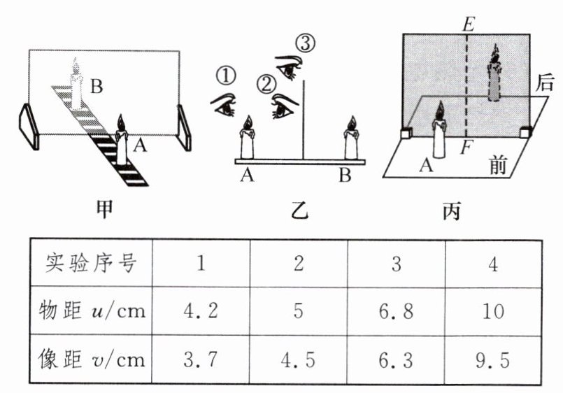 (4)若图丙中蜡烛 A 的位置保持不变,把镜子沿虚线 EF 平分成两块,把其中的一块向后平移一段距离,则蜡烛 A 通过这两块镜子