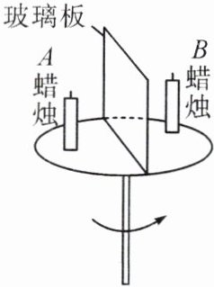 4. 新考向 科学思维 在校园科技节活动中,小明观看了“隔着玻璃吹蜡烛”的魔术。表演者介绍图中的道具后旋转平台,使玻璃板一侧正对观众,分两步完成了表演:①用两个打火机同时“点燃”两支蜡烛;②在玻璃板正对观众的一侧吹 A 蜡烛。观众看到两支蜡烛同时被“吹灭”。小明利用道具,和同学们一起探究其中的奥秘。