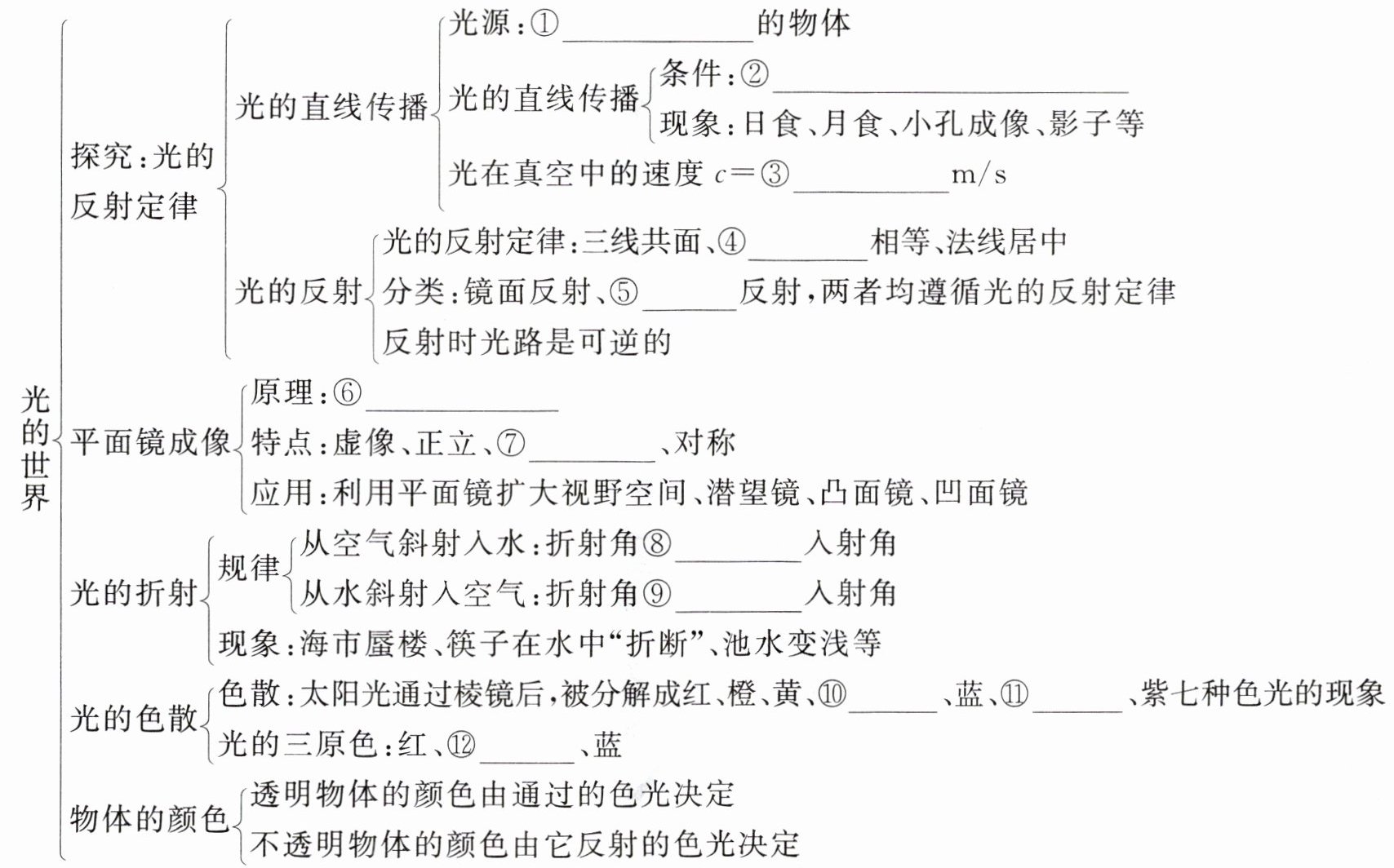 ①正在发光 ②同种均匀物质(介质) ③3×10⁸ ④两角 ⑤漫 ⑥光的反射 ⑦等大 ⑧小于 ⑨大于 ⑩绿 ⑪靛 ⑫绿