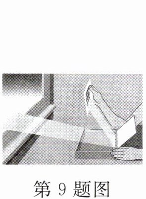 9. (2024·合肥蜀山区期末)如图所示,在“创作彩虹”的实践活动中,将平面镜斜插入装有水的容器,把它们放在从窗口射入的阳光下并对着白色墙壁(或白纸屏),调整镜面倾斜的角度,观察到墙面上出现彩虹。平面镜改变了光的传播方向,是因为光发生了