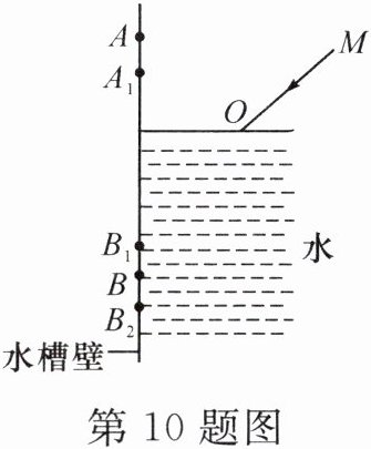 10. (2024·合肥蜀山区期末)如图所示,小华同学用激光笔照射水面,在水槽壁上出现两个亮点 A 和 B。若保持入射点 O 的位置不变,欲使点 A 下移至点 $ A_1 $,应使入射光线 MO 绕着点 O 沿