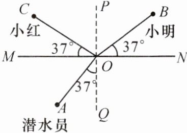 D.潜水员观察小明的像所对应的光路中,折射角为 $ 37^{\circ} $