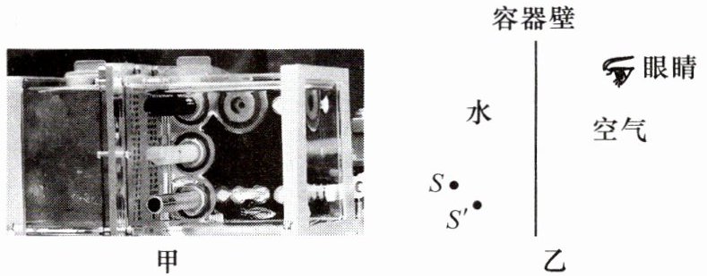 13. (2024·菏泽)2024 年 4 月 26 日,神舟十八号载人飞船成功对接中国空间站,装有 4 条斑马鱼的特制透明容器顺利转移到问天实验舱,如图甲所示。请你在图乙中画出航天员看到斑马鱼的光路图($ S $表示斑马鱼的实际位置,$ S' $表示航天员看到的斑马鱼的像的位置,不考虑容器壁对光线的影响)。