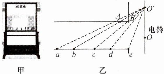 14. (2023·武汉)一块仪容镜如图甲所示,放在某学校走廊的 AB 处,仪容镜靠墙而立,镜面与墙壁平行,在另一面墙壁上的 O 处悬挂一个电铃,如图乙所示。小强同学沿着走廊的 ae 直线走动,若将人和电铃各自看作一个点,为了总能看到电铃通过仪容镜所成的像 $ O' $,则小强同学所在的区间是(