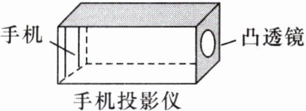 5. (2024·聊城)小慧同学计划制作一个“手机投影仪”。现有器材如下:焦距分别为 10 cm、20 cm、30 cm 的凸透镜各一个,手机一部,长为 30 cm 的纸盒等。如图所示,将手机和凸透镜分别固定在纸盒的两端,调整“投影仪”到墙面的距离,可在墙上看到手机画面清晰放大的像。下列说法正确的是(