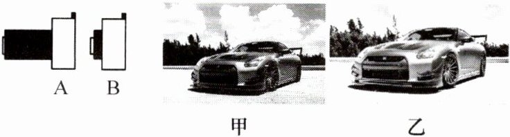 7. 图中 A、B 所示是同一架照相机的不同状态,甲、乙是这架照相机在这两种状态下拍摄同一赛车的两张图片,照片