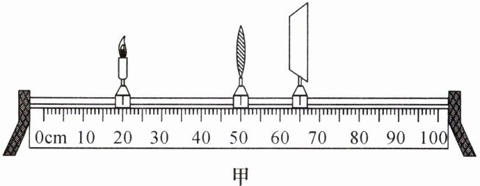 cm。如图甲所示,透镜、光源和光屏分别固定在“0”“40”和“15”刻度位置,要在光屏上看到清晰的像,光屏应向右