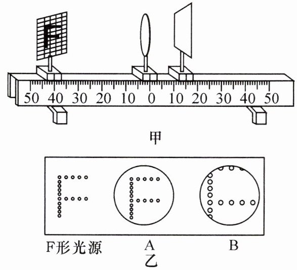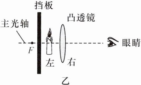 (2)F表示凸透镜的焦点,表面粗糙且不透明的挡板、点燃的蜡烛和凸透镜的位置如图乙所示,则人的眼睛透过凸透镜向左观察
