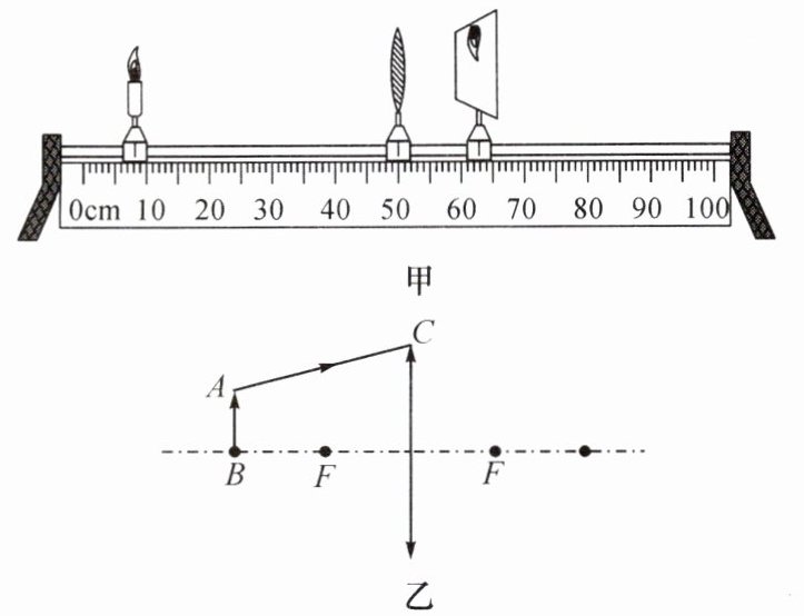 (1)请在图乙中画出物体$AB$(到凸透镜的距离恰好是透镜的两倍焦距)通过凸透镜所成的像$A'B'$,并画出光线$AC$经过凸透镜的折射光线。