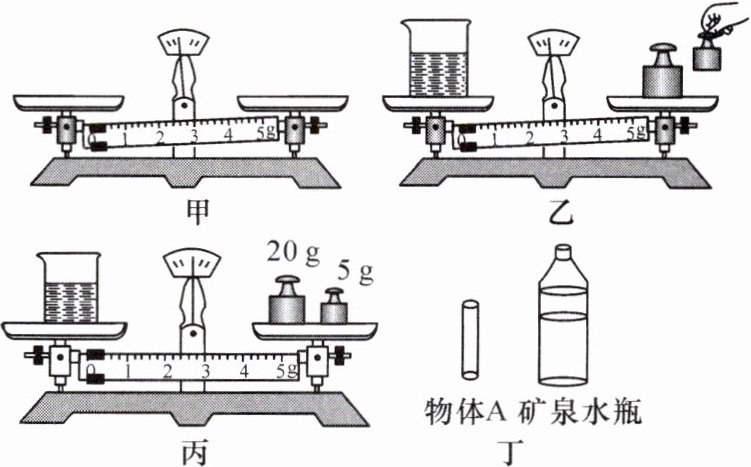(3) 在测量物体 A 的密度时,不慎碰坏了量筒,于是利用矿泉水瓶(图丁)代替量筒继续进行实验,实验步骤如下:
