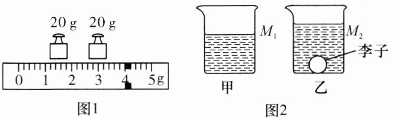 (2) 用天平测量李子的质量,当天平平衡时,右盘中的砝码和标尺上游码的位置如图 1 所示,李子的质量为