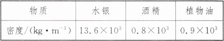 (3)若在空心部分注满某种液体后,球的总质量为 620 g,请参考下列部分物质的密度表,分析该液体可能是什么?