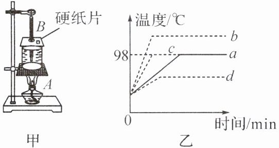 (5)小明根据实验数据绘制的水沸腾前后温度随时间变化的图像如图乙中的 $ a $ 所示,如果同组的小红减少烧杯中水的质量,水沸腾前后温度随时间变化的图像可能是图乙中的