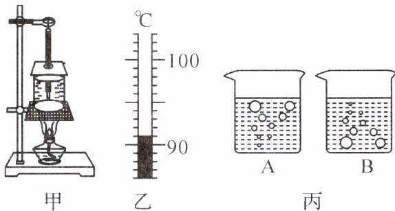 (1)当水温升到 90∘C 时,每隔 1min 记录一次水的温度,在实验中记录了如表所示的数据,图乙中温度计的示数是第 1min 时的温度,其示数为