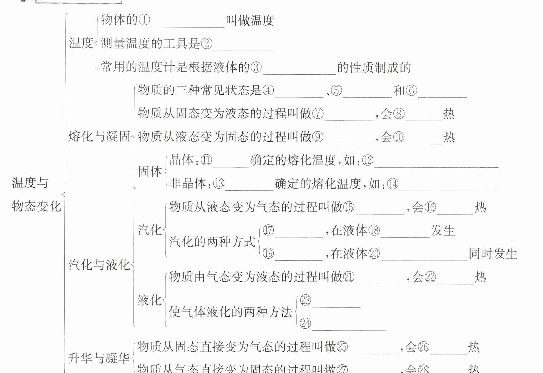 ①冷热程度 ②温度计 ③热胀冷缩 ④固态 ⑤液态 ⑥气态 ⑦熔化 ⑧吸 ⑨凝固 ⑩放 ⑪有 ⑬没有 ⑭蜡、松香、玻璃 ⑮汽化 ⑯吸 ⑰蒸发 ⑱表面 ⑲沸腾 ⑳表面和内部 ㉑液化 ㉒放 ㉓降温 ㉔压缩体积 ㉕升华 ㉖吸 ㉗凝华 ㉘放