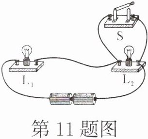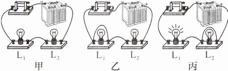 15. 如图甲所示电路,闭合开关后,L₁和L₂都不亮,现用一根导线检查故障原因。如图乙所示,将导线接在L₁两端时,L₁和L₂仍然不亮;如图丙所示,将导线接在L₂两端时,L₁亮,L₂不亮。根据上述现象,电路故障应该出现在