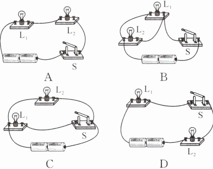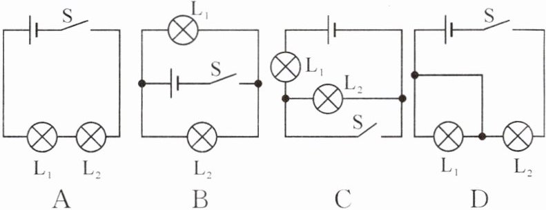 2. 如图所示的电路中,当开关 $ S $ 闭合时,灯泡 $ L_1 $、$ L_2 $ 并联的是(