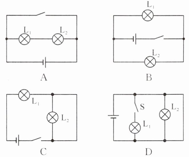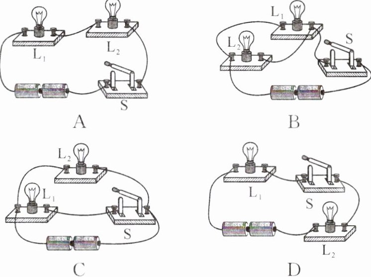 1. 在如图所示的四个电路中,开关能够同时控制两盏灯,且两灯并联的是(