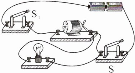 16. 在如图所示电路中,有一根导线连接错误,请在错误的导线上画“×”,并画出正确的连接方式。要求:改正后,灯泡和电动机并联,开关 $S$ 控制所有用电器,$S_1$ 只控制电动机。