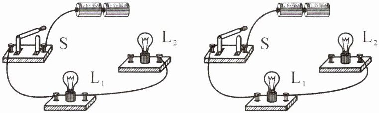 11. 用笔画线代替导线,将下面两个实物图补充完整。两个实物图分别为开关同时控制两个灯泡的两种方法,导线不能交叉。