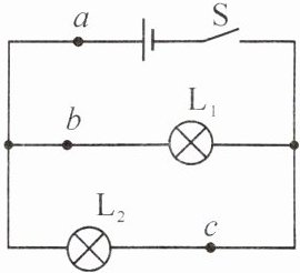 3. 如图,两盏灯并联在电路中,现用一只电流表来测量灯泡 $L_{2}$ 中的电流,在图中给出的 $a$、$b$、$c$ 三个位置中,电流表应连入的位置是(