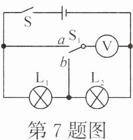 7. 如图所示,闭合开关$S$,当开关$S_{1}$接到$a$时,电压表示数为$6V$;当开关$S_{1}$接到$b$时,电压表示数为$2V$。下列说法中错误的是(