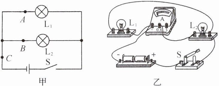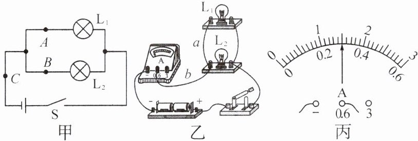 (1)图甲是他们设计的电路图,实验时需要测量 、、 三处的电流。图乙是他们某次测量时连接的实验电路,此时电流表测量的是