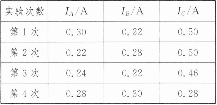 的电流。(2)该小组同学换用不同规格的小灯泡进行实验,用电流表多次测 $ A $、$ B $、$ C $ 三点电流,记录实验数据如下表。