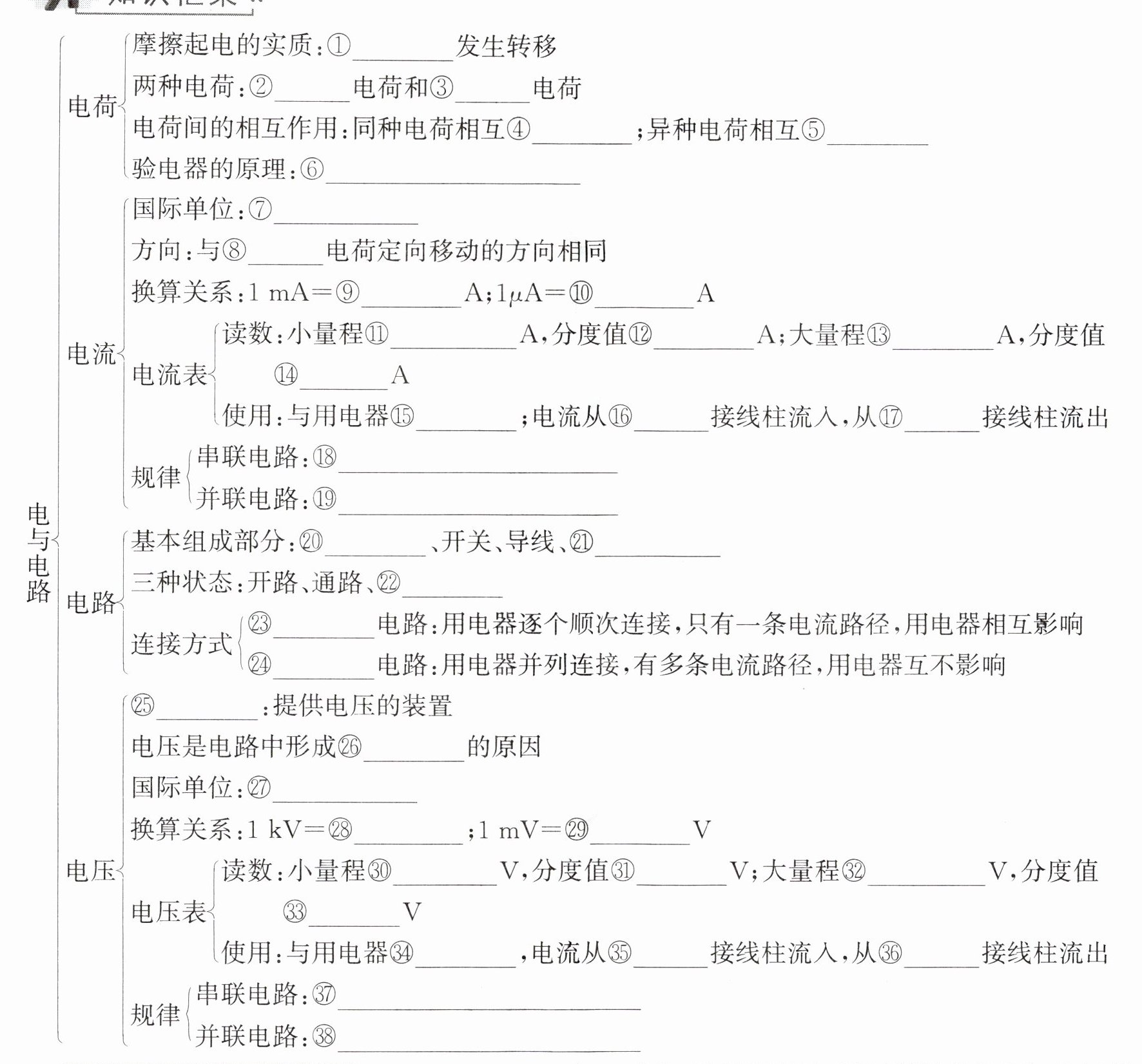 ①电子 ②正 ③负 ④排斥 ⑤吸引 ⑥同种电荷相互排斥 ⑦安培(A) ⑧正 ⑨$10^{-3}$ ⑩$10^{-6}$ ⑪0~0.6 ⑫0.02 ⑬0~3 ⑭0.1 ⑮串联 ⑯正 ⑰负 ⑱$I=I_{1}=I_{2}=\cdots \cdots =I_{n}$ ⑲$I=I_{1}+I_{2}+\cdots \cdots +I_{n}$ ⑳电源 ㉑用电器 ㉒短路 ㉓串联 ㉔并联 ㉕电源 ㉖电流 ㉗伏特(V) ㉘$10^{3}\ V$ ㉙$10^{-3}$ ㉚0~3 ㉛0.1 ㉜0~15 ㉝0.5 ㉞并联 ㉟正 ㊱负 ㊲$U=U_{1}+U_{2}+\cdots \cdots +U_{n}$ ㊳$U=U_{1}=U_{2}=\cdots \cdots =U_{n}$