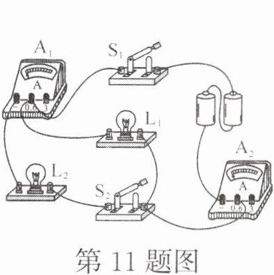 11. (2024·合肥蜀山区期末)如图所示电路,闭合开关后两灯均能发光,过了一段时间后有一个灯泡突然熄灭且电流表$A_{1}$和$A_{2}$示数相同,则电路发生的故障可能是(
