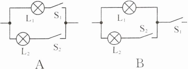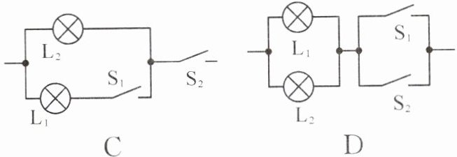 7. (2023·安徽)老师给小龙一个密封盒,其表面可见两个开关$S_{1}$、$S_{2}$和两盏灯$L_{1}$、$L_{2}$。为了探究开关和灯在密封盒内是如何连接的,小龙进行了如下操作:先闭合$S_{1}$,只有灯$L_{1}$发光;又闭合$S_{2}$,两灯都发光;再断开$S_{1}$,两灯都熄灭。符合上述实验结果的连接方式为(