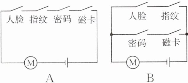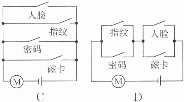 6. (2024·淮南期末)智能门锁具有人脸识别、指纹、密码、磁卡四种解锁方式,任意一种方式都能开锁。下列符合要求的电路图是(