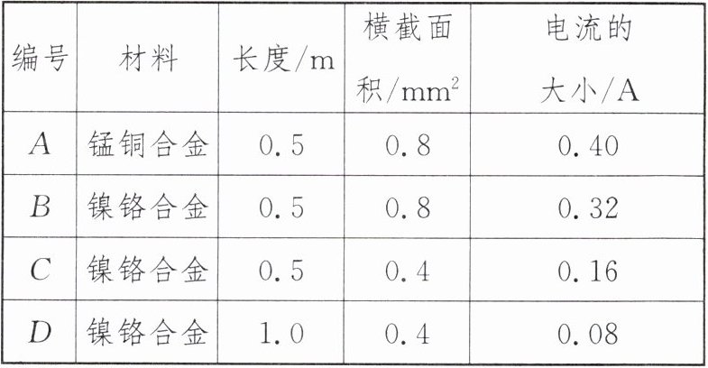 2. 在“探究影响导体电阻大小的因素”的实验中,某实验小组同学利用如图所示的电路对“导体电阻跟它的材料、长度和横截面积有关”的猜想进行实验验证。实验中使用 4 根电阻丝,分别接入实验电路,得到的数据如表所示。