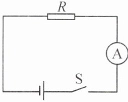 7. 在如图所示的电路中,电阻 $ R $ 的阻值为 $ 10 \, \Omega $,闭合开关 $ S $,电流表的示数为 $ 0.9 \, A $。
