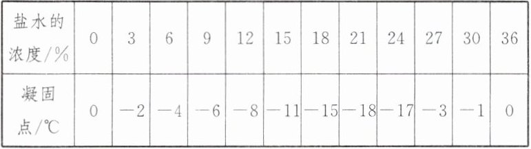 ②他们发现所测得盐水的凝固点并不相同,于是对比了双方实验过程,发现烧杯中装水都是 200 mL,小明加了一汤匙的盐,而小红加了 3 汤匙的盐,由此做出猜想:盐水的凝固点与盐水的浓度有关。接着多次实验得出不同浓度盐水的凝固点如表;