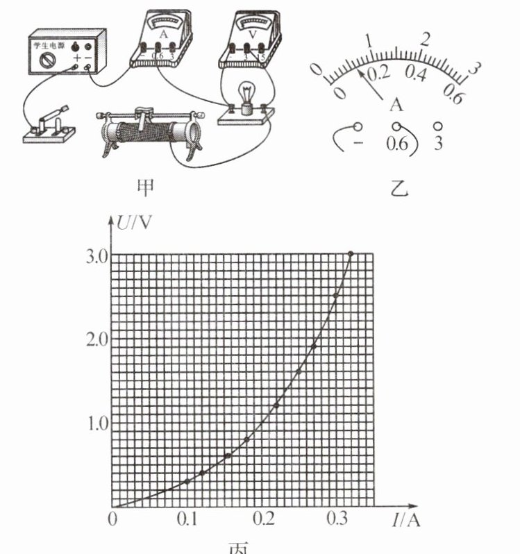 $A$。(3) 根据实验数据绘制的 $U - I$ 图像如图丙,小灯泡未发光时电阻可能为