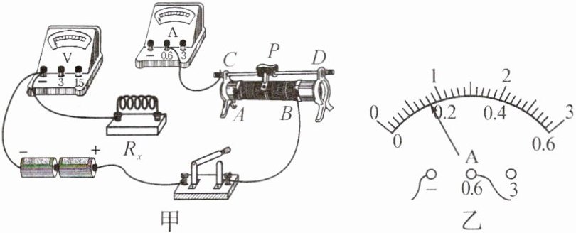 6. 如图甲所示,是小明在“测量定值电阻的阻值”时连接的电路。电源由两节新干电池串联组成,滑动变阻器的铭牌上标有“$50\ \Omega\ \ 1\ A$”的字样。