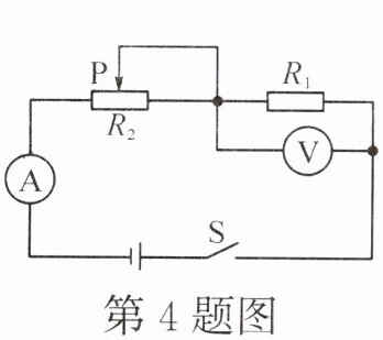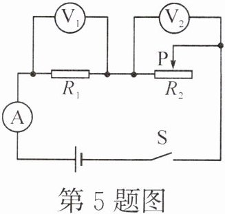 5. (2024·达州)如图所示,$ R_{1} $ 为定值电阻,$ R_{2} $ 为滑动变阻器,电源电压保持不变,闭合开关 S,滑动变阻器的滑片 P 向右移动的过程中,下列说法正确的是 (