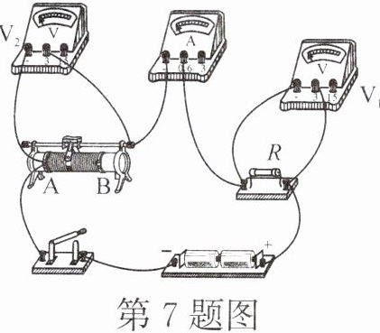 7. (2024·安徽)如图所示的电路中,电源两端电压保持不变,R 为定值电阻。闭合开关,在保证电路元件安全的前提下,将滑动变阻器的滑片由 B 端滑到 A 端,电压表 $ V_{1} $、电压表 $ V_{2} $、电流表 A 示数变化量的绝对值分别为 $ \Delta U_{1} $、$ \Delta U_{2} $、$ \Delta I $。则 (